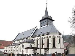 Die Pfarrkirche steht am östlichen Ortsrand und ist bereichsweise vom Friedhof umgeben. Sie hat einen neugotischen, eingezogenen Chor mit vier Jochen und einem Fünfachtelschluss. Der Chorraum wird von Kreuzrippengewölben überspannt und von Fenstern mit zweibahnigem Maßwerk belichtet. Das Langhaus ist eine Pseudobasilika mit fünf Fensterachsen auf den Längsseiten. Das nur wenig überhöhte Mittelschiff wird von einer hölzernen Flachdecke überspannt, die neugotischen Seitenschiffe von Gewölben.[2] Die Fassade ist ringsherum mit hohen, schlanken Strebepfeilern besetzt, die die Standsicherheit der Gewölbe sicherstellen.