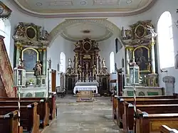 Der Hochaltar entstand in der Zeit um 1700, wurde allerdings 1741 in Verbindung mit der Neugestaltung des Gebäudes verändert und 1848 renoviert. Im Mittelpunkt des marmorierten Altarretabels steht zwischen zwei hohen Säulenpaaren unter einem Baldachin, von dem ein seitlicher Vorhang herabhängt, eine Marienstatue mit Jesuskind, Krone und Zepter, die möglicherweise noch aus gotischer Zeit stammt, aber später barock überarbeitet wurde. Begleitet wird sie von zwei kleinen Engeln links und rechts neben ihrem Kopf. Zwischen den Säulen stehen ehrfürchtig in leicht gebeugter Haltung links der heilige Joachim und rechts die heilige Anna, die Eltern der Gottesmutter Maria,. Es wird angenommen, dass diese beiden Figuren 1740 geschnitzt wurden. In einem Gemälde im Altarauszug ist die Heilige Dreifaltigkeit dargestellt: Jesus mit dem Kreuz und Gottvater blicken auf die Weltkugel hinab und über ihnen schwebt der Heilige Geist in Gestalt der Taube. Über dem Gemälde ist eine Heiliggeisttaube angebracht, die früher ihren Platz an der Kanzel hatte. Links und rechts auf dem Gebälk des Altarauszugs sitzen zwei Engel. Der von vier vergoldeten kleinen Säulchen eingegrenzte Tabernakel stammt aus dem Ende des 19. Jahrhunderts. Über den Durchgängen links und rechts vom Altar, den Opfergangsportalen, stehen die Figuren von heiliger Katharina und heiliger Barbara. Die Gemälde an den Giebeln der Portale zeigen den heiligen Apostel Judas Thaddäus und die heilige Maria Magdalena. Auf die Türen sind der heilige Franziskus und der heilige Antonius aufgemalt.[1]