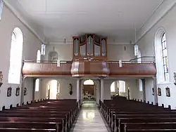 Die heutige Orgel stammt von der französischen Firma Willy Meurer[3], die das Instrument 1972 unter Verwendung von Teilen einer Stumm-Orgel von 1862 und einer Sebald-Orgel von 1952[4] in einem neuen Gehäuse erbaute. 2003 sollte die elektrische Spieltraktur mechanisiert werden und in diesem Zuge der angebaute Spielschrank zu einem freistehenden Spieltisch umgebaut werden. Zunächst wurde die Firma Walcker beauftragt, doch gab man allerdings nach einigen Problemen während des Umbaus und dem ungeklärten Verschwinden der ausgelagerten Prospektpfeifen den Auftrag weiter an die Firma Hugo Mayer[5], die einen neuen freistehenden Spieltisch inklusive mechanischer Spieltraktur baute, sowie die verschwundenen Prospektpfeifen durch neue ersetzte.[3] Das Schleifladen-Instrument, das auf einer Empore aufgestellt ist, verfügt über 22 Register, verteilt auf 2 Manuale und Pedal[3]. Die Spieltraktur ist mechanisch, die Registertraktur elektrisch[3]. Die Disposition lautet wie folgt[3]: