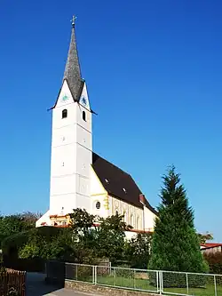 Die im Kern im 14./15. Jahrhundert gebaute gotische Saalkirche wurde im letzten Viertel des 17. Jahrhunderts barock umgestaltet. Sie besteht aus dem Langhaus, dem eingezogenen, von Strebepfeilern gestützten Chor mit Fünfachtelschluss im Osten, der Sakristei an der Südwand des Chors und dem angeblich 1698 im Westen des Langhauses errichteten Kirchturm. In seinem obersten Geschoss steht der Glockenstuhl. Zwischen den Giebeln mit den Zifferblätter der Turmuhr erhebt sich ein spitzer Helm.