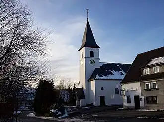 Das auf einer Anhöhe stehende Gebäude wurde von 1932 bis 1933 nach Plänen des Architekten Wilhelm Dellweg errichtet. Die Wände des länglichen Schiffes sind weiß verputzt, es ist mit Schiefer gedeckt. Der dreiseitig schließende Chor ist eingezogen und der Turm eingestellt. Der Innenraum wird durch ein fünfseitiges Holztonnengewölbe bestimmt. Das Schiff und der Chor sind durch einen runden Triumphbogen getrennt. Der Chorraum wurde ursprünglich nach Entwürfen von Bruder Ludger Hohmann aus Maria Laach figürlich bemalt. Die Bemalungen wurden 1954 übertüncht, stattdessen befindet sich dort ein Kruzifix von Heinrich Püts. Die Stirnwand ist durch zwei Glasbilder von Jupp Gesing gegliedert; sie wurden 1977 angefertigt.