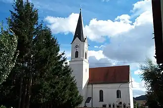 Die Saalkirche wurde 1731 eingeweiht. Sie besteht aus einem Langhaus, einem eingezogenen, halbrund geschlossenen Chor im Osten und einem Chorflankenturm an dessen Nordwand, dessen quadratische untere Geschosse vom Vorgängerbau aus der zweiten Hälfte des 13. Jahrhunderts stammt. Er wurde in der Zeit des Barock mit einem achteckigen Geschoss aufgestockt, das die Turmuhr und hinter den Klangarkaden den Glockenstuhl beherbergt. Die Schindeln seines spitzen Helms wurden 1973/74 durch Kupfer ersetzt.