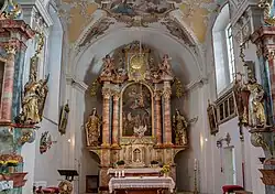 Die Saalkirche wurde 1687/88 nach einem Entwurf von Lorenzo Sciasca erbaut. Sie besteht aus einem Langhaus, einem eingezogenen, halbrund geschlossenen Chor im Osten und einem Kirchturm auf quadratischem Grundriss im Westen, dessen achteckiges Obergeschoss die Turmuhr und den Glockenstuhl beherbergt, und der mit einer Welschen Haube bedeckt ist. Der Innenraum ist mit einem Stichkappengewölbe überspannt. Der 1747 eingebrachte Stuck wird Johann Baptist Zimmermann zugeschrieben, die Deckenmalereien im Chor mit der Darstellung der Trinität und im Langhaus mit der Himmelfahrt Mariens stammen von Joseph Adam von Mölk. Der von den Statuen der Katharina von Alexandrien und der Barbara von Nikomedien flankierte Hochaltar wurde 1888/89 unter Verwendung des Altarretabels von 1713 errichtet, auf dem die Unbefleckte Empfängnis dargestellt ist.