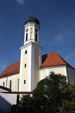 Das Langhaus der Saalkirche wurde 1729–1732 unter Amandus Röls, Abt des Klosters Heilig Kreuz, errichtet. Der eingezogene, dreiseitig geschlossene Chor im Süden, der Chorflankenturm auf quadratischem Grundriss an der Westwand und die Sakristei an der Ostwand des Chors wurden 1758 hinzugefügt. Das oberste, achteckige Geschoss des Chorflankenturms beherbergt die Turmuhr und den Glockenstuhl. Darauf sitzt eine Zwiebelhaube.