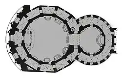 Die Kirche wurde als zwölfeckiger Zentralbau errichtet, was zu dieser Zeit sehr ungewöhnlich war. Sie trug ein geschindeltes Zeltdach. Den Kanten des Zwölfecks waren Strebepfeiler zur Lastableitung vorgelagert. Um das Zwölfeck verlief ein zweigeschossiger Umgang. Im Osten war dem Zwölfeck ein Psallierchor vorgelagert. Im Inneren hatte der Zentralbau ein sternförmig verlaufendes Rippengewölbe, das in der Mitte auf einer Säule ruhte. An dieser zentralen Säule stand auch der Hauptaltar.[3]