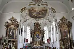 Auch die Grisaillen im Chor stammen von Joseph Christ. Das Deckenfresko des Chores stellt die Marienkrönung dar. Es wurde 1893 von August Müller-Warth geschaffen.