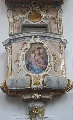 - Die Stuckkanzel wurde um 1766 geschaffen. Das Fresko am Kanzelkorb stellt den Guten Hirten dar und wird Joseph Christ zugeschrieben.