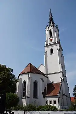 Die neugotische Hallenkirche wurde 1860 nach einem Entwurf von Matthias Berger erbaut. Sie besteht aus dem Langhaus, dem eingezogenen, dreiseitig geschlossenen Chor im Osten, dem Chorflankenturm auf quadratischem Grundriss an der Nordwand des Chors und einem Vorzeichen vor der Fassade im Westen. Die Außenwände der Kirche sind mit Strebepfeilern versehen. Der in den unteren Teilen vom 1488 errichteten Vorgängerbau stammende Chorflankenturm wurde um 1854 um ein achteckiges Geschoss für die Turmuhr und den Glockenstuhl mit vier Kirchenglocken[1] aufgestockt. Den Abschluss bildet ein aus Gusseisen gefertigter, mit Fialen verzierter Spitzhelm.