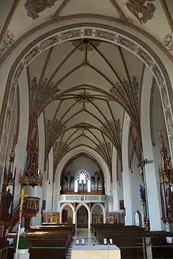 Die Innenräume von Langhaus und Chor sind mit Netzgewölben überspannt. Über dem Chorbogen befindet sich eine Darstellung des Jüngsten Gerichts. Auf dem Altarretabel des Hochaltars ist die Himmelfahrt Mariens dargestellt. Die Orgel mit 18 Register, verteilt auf zwei Manuale und Pedal wurde 1974 von WRK Orgelbau gefertigt.