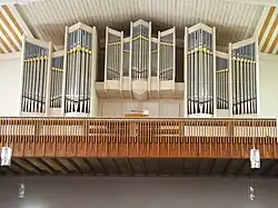 Auf der rückwärtigen Empore befindet sich seit 1993 eine Orgel mit insgesamt 32 Registern auf zwei Manualen und Pedal. Diese wurde von der Firma Orgelbau Sandtner errichtet. Der Prospekt passt sich mit seiner zur Mitte hin ansteigenden Form der Dachneigung an. Dabei ist das Gehäuse in drei Felder aufgeteilt. Die beiden äußeren Felder sind ihrerseits wiederum dreiteilig und enthalten die längeren Orgelpfeifen; das mittlere mit den kürzeren Orgelpfeifen ist fünfteilig.[6]
