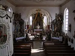 Die obere Empore ist mit Gemälden aus der Mitte des 17. Jahrhunderts versehen. Gezeigt werden an der oberen Empore Darstellungen der Erzengel sowie der hl. Joseph und Johannes der Täufer. Die untere Empore stellt die Passion Christi dar. Aus der Zeit um 1500 stammt die Figur des hl. Leonhard mit einem kleinen knienden Gefangenen. Das Kruzifix stammt aus der zweiten Hälfte des 16. Jahrhunderts.