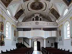 Den westlichen Abschluss des Langhauses bildet eine Doppelempore mit geschweiften Brüstungen. Die Brüstung der unteren Empore ist mit einem Stuckdekor aus Laub– und Bandelwerk, an den Seiten auch Gitterwerk, im Stil des frühen Rokoko überzogen. Die obere Empore, auf der die Orgel steht, wurde vermutlich erst um 1790 eingebaut. Sie ist mit Medaillons und Girlanden im Stil des Klassizismus verziert. In der Mitte ist König David, der auf der Harfe spielt, dargestellt.