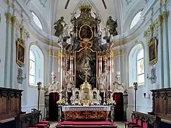 - Der von vier Säulen und zwei Pilastern mit Halbsäulen gerahmte Hochaltar ist eine Arbeit des frühen Rokoko aus der Zeit um 1745. Der Altartisch ist mit einem vergoldeten Schnitzornament verziert. Das Altarblatt wurde vermutlich von Matthias Schiffer ausgeführt und ist dem Patrozinium der Kirche, der Himmelfahrt Mariens, gewidmet. Über dem Gemälde prangt das Wappen von Katharina von Aham zu Neuhaus, die von 1723 bis 1757 Äbtissin des Klosters Niedermünster war. Auf dem Auszugsbild sieht man den Erzengel Michael, der Luzifer stürzt. Auf den drehbaren Seiten des Tabernakels aus der Mitte des 18. Jahrhunderts sind die Szenen der Verkündigung, der Geißelung und der Dornenkrönung gemalt. Das Altarkreuz stammt aus der zweiten Hälfte des 18. Jahrhunderts. Die beiden weiß-gold gefassten Assistenzfiguren stellen den heiligen Wolfgang von Regensburg und den heiligen Blasius, einen der Vierzehn Nothelfer, dar. Die weit ausladenden Gebälkstücke sind mit ebenfalls weiß-gold gefassten Engelsfiguren besetzt. Die seitlichen Durchgänge werden von Vasen bekrönt.