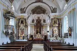 Das einschiffige Langhaus wird von einer flachen Stichkappentonne gedeckt. Der eingezogene Chor ist halbrund geschlossen und weist ein halbrundes, ebenfalls von Stichkappen durchbrochenes Tonnengewölbe auf. Die Wände gliedern verkröpfte Dreifachpilaster mit Stuckkapitellen, über denen ein mehrfach profiliertes Gebälk und ein kräftig vorspringendes Gesims unter dem Gewölbeansatz verläuft. Der Innenraum wird durch große Rundbogenfenster und Lünettenfenster, die in den Stichkappen eingeschnitten sind, beleuchtet.