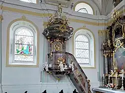 - Die Kanzel, eine Arbeit aus der Zeit um 1760, ist mit vergoldeten Rocailleschnitzornamenten verziert. Der Kanzelkorb ist mit den weiß-gold gefassten Figuren der vier Evangelisten und ihren Symbolen besetzt. Der Schalldeckel wird von einer ebenfalls weiß-gold gefassten Schnitzfigur eines Bischofs, die bereits in der zweiten Hälfte des 15. Jahrhunderts entstand, bekrönt. Die Figur wird auch als heiliger Augustinus von Hippo interpretiert, Kirchenvater und Verfasser der Augustinusregel, nach der die Augustiner-Chorherren ihr Leben ausrichten.