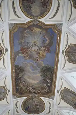 Die Deckenmalereien wurden 1791 von dem aus der Steiermark stammenden Freskenmaler Matthias Schiffer ausgeführt. Die – wie in der Zeit üblich – gemalten und nicht stuckierten Rahmen sind mit kleinen Rundspiegeln besetzt.