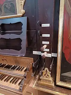 Das Instrument hat heute 13 Register auf zwei Manualwerken und Pedal.[8] Als Besonderheit sind wieder zwei Spielanlagen in Gehäusefront und -rückwand vorhanden, die das Werk tonhöhenversetzt anspielen. Aus demselben Grund sind die Töne Ais/B und Dis/Es auch in allen Oktavlagen doppelt besetzt.[9]