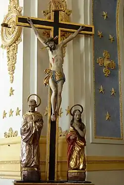 - Die Figur des heiligen Bernhard von Clairvaux der Kreuzigungsgruppe am rechten Chorbogen wird ins 15. Jahrhundert datiert, die Figur der Maria Magdalena stammt aus der ersten Hälfte des 18. Jahrhunderts.