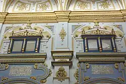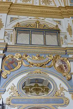 Stuckkartuschen über dem Durchgang zu den Chorkapellen umrahmen auf der rechten Seite die Wappen der Stifter Berchthold von Graisbach und seiner Gemahlin Adelheid, auf der linken Seite die Wappen des Kurfürsten Ferdinand Maria von Bayern und seiner Gemahlin Henriette Adelheid von Savoyen, mit deren Unterstützung das Kloster nach dem Dreißigjährigen Krieg wieder aufgebaut wurde.