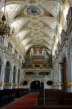 Das dreischiffige Langhaus ist in neun Joche gegliedert. Die beiden westlichen Joche nehmen die ehemalige Nonnenempore und die darüberliegende Orgelempore ein. Zu den zweigeschossigen, kreuzgratgewölbten Seitenschiffen öffnen sich Rundbogenarkaden, die auf kräftigen Pfeilern mit Pilastervorlagen aufliegen. Im oberen Geschoss der Seitenschiffe verläuft ein Gang, der zum Kirchenschiff nur durch vergitterte, mit gedrechselten Säulen verzierte Logen (corretti) geöffnet ist. Die darunter liegenden Wandfelder sind mit lateinischen Texten von Marienhymnen versehen. Ursprünglich waren sie mit Szenen aus dem Marienleben ausgefüllt. Das Mittelschiff wird von einem Tonnengewölbe mit tief einschneidenden Stichkappen gedeckt, die den Lichteinfall durch die Obergadenfenster ermöglichen. Ein verkröpftes Gesims markiert den Gewölbeansatz. Der um zwei Stufen erhöhte, zweijochige Chor ist dreiseitig geschlossen und ebenfalls mit einer Stichkappentonne gedeckt.