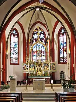 Der Hochaltar und Seitenaltäre wurden von dem Architekten Lambert von Fisenne (Gelsenkirchen) entworfen, und durch Carl Frank von der Werkstätte für kirchliche Kunst (Trier) in den Jahren 1897 bis 1898 ausgeführt. Der Altaraufsatz wurde im gleichen Zeitraum von der Firma Gebrüder Port (Münstermaifeld) geschaffen. Bildhauer Ernst Hoffmann (Sulzbach) schuf 1936 das über 3 m hohe Sühnekreuz mit lebensgroßem holzgeschnitzten Corpus, das bis Ende der 1990er Jahre hinter der Kirche stand.[2]