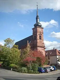 Der Grundstein zur Saalkirche nach einem Entwurf des Mainzer Hofbaumeisters wurde am 23. September 1623 gelegt. Sie besteht aus einem Langhaus und einem eingezogenen Chor mit halbrundem Abschluss im Osten. 1893 wurde das Langhaus verlängert und ihm ein mit Lisenen und Gesimsen gegliederter Fassadenturm in Formen der Neorenaissance aus Quadermauerwerk im Westen vorgestellt. Das oberste Geschoss des mit einer schiefergedeckten Zwiebelhaube und einer Laterne versehenen Fassadenturms beherbergt die Turmuhr, das darunter liegende den Glockenstuhl, in dem vier Kirchenglocken hängen. In den Jahren 1765–1766 entstand die jetzige Kirchenausstattung. Die auf der Empore stehende Orgel hat 21 Register, 2 Manuale und ein Pedal und wurde 1991 von Horst Hoffmann gebaut.[1]