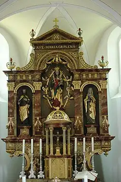 Der Hochaltar mit spätgotischer Madonna stammt aus dem 19. Jahrhundert und ersetzte den vorherigen Hochaltar. Zur Originalausstattung gehören wahrscheinlich die beiden barocken Seitenaltäre, die der heiligen Familie bzw. dem heiligen Sebastian gewidmet sind.