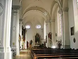 Die Kirche ist 72 Meter lang, 16 Meter breit und 11 Meter hoch. Der frühbarocke Hallenraum ist durch pilasterbesetzte Mittelpfeiler unterteilt. Die Kirche ist eine zweischiffige, mit je vier Jochen versehene Hallenkirche. Der Turm hat ein achteckiges Glockengeschoss mit Kranzgesims (1708) und Zwiebel. Unter dem Satteldach ist ein mit sechs Rundbogenfenstern gegliedertes Langhaus. Dem vorangestellt sind ein niedriger abgeschrägter Ostchor und eine rechteckige Sakristei. Die Altargemälde stammen vom Memminger Maler Johann Heiss. Außerhalb der Kirche ist eine Gedenktafel angebracht, die an Pfarrer Raimund Mattes (1879–1914) erinnern soll.