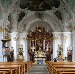 Die ganz im Barockstil gehaltene Kirche entstand als Werk des 71-jährigen Baumeisters Peter Thumb in den Jahren 1753 bis 1755. Das Geläut der Kirche besteht aus neun Glocken.[1] Die reiche barocke Auszierung mit Stuck stammt von Meister Johann Georg Gigl aus der Wessobrunner Schule, das Decken- und Chorbogenfresko von Barockmaler Eustachius Gabriel. Das Äußere der Kirche ist von Lisenen gegliedert.[2]