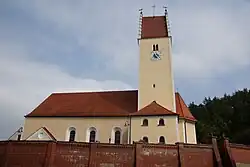 Die Saalkirche ist im Kern spätgotisch. Sie besteht aus einem Langhaus, das mit einem Satteldach bedeckt ist. Es wurde 1680 erweitert und 1904 nach Westen verlängert. An der Südwand des eingezogenen, dreiseitig geschlossenen Chors im Osten steht ein Chorflankenturm, der mit einem Satteldach zwischen Staffelgiebeln bedeckt ist. Sein oberstes Geschoss beherbergt die Turmuhr und hinter den als Biforien gestalteten Klangarkaden den Glockenstuhl. Die Längsachse des Chors ist von der Mittelachse des Langhauses nach Norden verschoben.