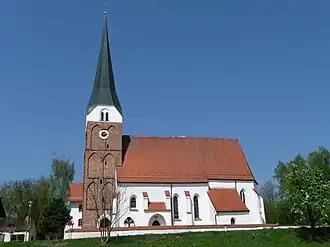 Die Kirche wurde laut Inschrift am Chorbogen 1502 unter Abt Gregor des Klosters St. Salvator begonnen und 1519 vollendet. Die Kirche ist ein Beispiel für den stilistischen Konservatismus in Bezug auf regionale spätgotische Formen. Insbesondere im vierjochigen Schiff ist die späte Entstehungszeit erkennbar. Das nahezu tonnenförmige Gewölbe ist mit einem dünnen, aufgelegten Rippennetz versehen. Beachtenswert ist die Kombination von jochübergreifenden Parallelrippen und geknickten Rippen innerhalb des Jochabstands. An den Wänden finden sich schlichte Schildbogenstellungen mit halbrunden Diensten. Im Westen ist eine dreijochig überwölbte Empore eingebaut. Der eingezogene, zweijochige Chor ist mit einem dreiseitigen Schluss versehen. Im Gewölbe ist ein Rippenmuster mit wechselnden großen und kleinen Scheitelrauten eingezogen, wodurch sich seitlich unregelmäßige Fünfecke bilden, ähnlich wie im Schiff der Wallfahrtskirche Grongörgen. Die Rippen entspringen aus kräftigen Wandvorlagen. Die farbige Fassung des Gliederungsgerüsts wurde stark erneuert. An der Chornordseite ist der Stumpf eines alten, vermutlich spätromanischen Turms erhalten. Bei dem spätgotischen Neubau wurde ein Turm in Backsteinmauerwerk mit verputzten Walmgiebeln und achtseitigen Spitzhelm an der Westseite aufgeführt.