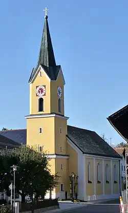 Die neuromanische Saalkirche wurde 1880 erbaut. Sie besteht aus einem Langhaus, einem eingezogenen, dreiseitig geschlossenen, von Strebepfeilern gestützten Chor im Norden und einem dreigeschossigen Fassadenturm im Süden, dessen oberstes Geschoss mit abgeschrägten Ecken die Turmuhr und den Glockenstuhl beherbergt, und der mit einem spitzen Helm bedeckt ist.