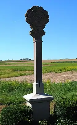 Der Bildstock hat einen kreisrunden Bildaufsatz. Ein Blütenkranz rahmt die Darstellung der Krönung Mariens durch die Heiligste Dreifaltigkeit ein. Unterhalb einer Taube, die den Heiligen Geist symbolisiert, halten Jesus (links) und Gottvater (rechts) eine Krone über die kniende Maria. Die äußere Begrenzung bilden vier Engel, deren Flügel sich miteinander verschlingen. Darunter befindet sich ein Relief des Ortspatrons Laurentius mit dem Rost.[4]