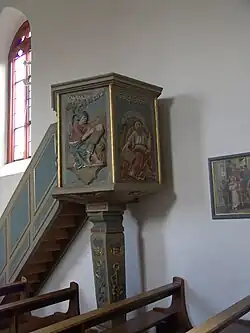 Um das Jahr 1583 kam der Taufstein mit einem ausladenden Volutenfuß und zwei Engeln in die Kirche. Das Wappen derer von Crailsheim und von Pappenheim verweist auf die Dorfherren. Auf dem Holzdeckel stellt eine Gipsfigur Jesus als Knaben dar. Die Kanzel aus Sandstein stammt ebenfalls aus dem 16. Jahrhundert. Der polygone Korpus enthält Reliefs der vier Evangelisten.