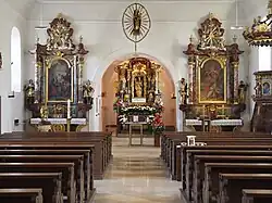 Auf dem spätbarocken Taufstein aus Sandstein steht eine Holzgruppe der Taufe Christi im Rokokostil. Die Kanzel im Rokokostil von 1766 stammt wie der Hochaltar von Stefan Bergbichler. Das Deckengemälde von Otto Gebhard aus Prüfening von 1762 zeigt den englischen Gruß.