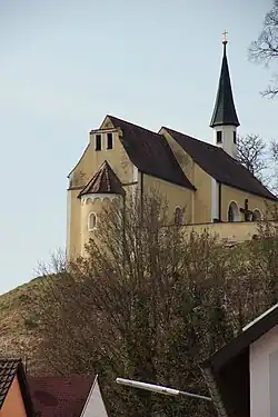 Im eingezogenen Chor mit zwei Jochen der Saalkirche mit östlicher Apsis steckt die romanische Burgkapelle aus dem 12. Jahrhundert. Ihr Innenraum ist mit einem Kreuzgratgewölbe überspannt. An sie wurde 1819 nach Westen das Langhaus angebaut. Aus dem Satteldach des Langhauses erhebt sich im Westen ein achteckiger Dachreiter, der den Glockenstuhl beherbergt, und der mit einem spitzen Helm bedeckt ist. Zur Kirchenausstattung gehören 14 Kreuzwegstationen, deren Bilder erneuert wurden.