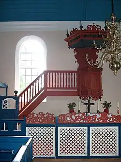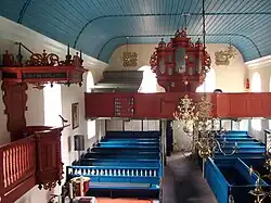 Der schlicht gehaltene Innenraum wird von einer flachen Holzdecke abgeschlossen. Die bekrönte Kanzel, die aus der alten Kirche übernommen wurde, und der Altar befinden sich gegenüber dem Eingang zentral an der Nordwand, eine Orgelempore an der Westwand. Der Altar wird durch eine verzierte Schranke abgetrennt. Kronleuchter wurden 1785, 1786 und 1895 gestiftet. Zu den Vasa Sacra gehören eine romanische Patene, ein Kelch (wahrscheinlich aus dem 17. Jahrhundert), eine Kanne und Dose (1899) und ein Krankenkelch (nach dem Zweiten Weltkrieg).[1]
