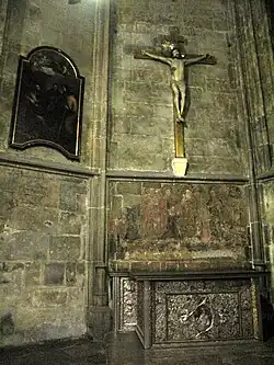 Die Seitenkapellen am nördlichen Seitenschiff der Maria-Magdalenen-Kirche nahmen einige ihrer zahlreichen Altäre auf. Von den Seitenkapellen am nördlichen Seitenschiff sind vier als einzige verbliebene Bauteile der Kirche bis heute erhalten: Die quadratische Kapelle N1 am westlichen Ende gehörte einer Marienbruderschaft.[28] Sie liegt, genauso wie die Sakristei, nicht im eigentlichen ehemaligen Kirchenraum, sondern schon in der Klausur des Burgklosters. Der Raum, der direkt an den Kapitelsaal des Burgklosters anschloss, diente im 18. Jahrhundert als Leichenhaus. Beim Umbau im 19. Jahrhundert wurde in den hohen Raum eine Zwischendecke eingezogen; in den 1980er Jahren wurde hier ein Treppenhaus eingebaut, das im Zuge des Umbaus in Verbindung mit der Errichtung des Europäischen Hansemuseums wieder zurückgebaut wurde.