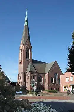 Die gegenwärtige kreuzförmige Backstein-Saalkirche entstand 1904 bis 1906 anstelle des oft veränderten Vorgängerbaus. Sie ist ein eklektizistisches Gebäude, das neugotische und neuromanische Elemente vereinigt, innen verbunden mit Jugendstil. Architekt war Wilhelm Voigt.