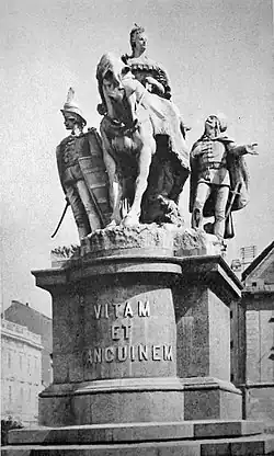 Auf der Frontseite des Denkmalsockels standen mit großen Lettern die Worte VITAM ET SANGUINEM (die im Königreich Ungarn benutzte Eidesformel „Unser Leben und unser Blut“) zur Erinnerung an jenes denkwürdige Ereignis des 11. September 1741 im Preßburger Schloss.