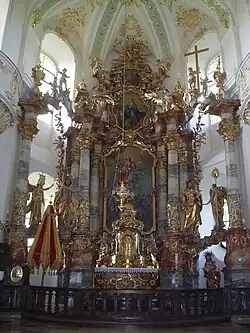 - Der Gnadenaltar im Rokokostil ist mit dem Gnadenbild versehen und wird auch Brunnen- oder Quellenaltar genannt. Er wurde 1756 vom Bildhauer Johann Joseph Meyer aus Tirol erbaut. Den Unterbau mit Brunnenschale und Voluten ergänzte 1953 Ernst Steinacker.