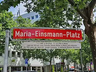 In Mainz gab es bereits 2014 einen Beschluss des Ortsbeirats Altstadt, einen Platz nach Maria Einsmann zu benennen, doch fehlte eine geeignete Stätte dafür. Diese entstand in den Folgejahren durch den Umbau der Großen Langgasse. Am 25. September 2019 wurde im Stadtrat die Benennung eines dort neugeschaffenen Bereichs der Fußgängerzone als „Maria-Einsmann-Platz“ beschlossen. Die offizielle Einweihung des Platzes fand am 6. März 2020 mit der Errichtung des Straßenschilds und einer erklärenden Tafel statt. Die Stadt Mainz würdigte damit nach eigener Aussage eine Frau mit ungewöhnlicher Lebensgeschichte. Zur Platzbenennung kurz nach dem 61. Todestag von Maria Einsmann sowie zum Internationalen Frauentag gab das Frauenbüro der Stadt Mainz die Broschüre „Die Frau in Männerkleidung. Der Fall Maria Einsmann“ heraus.