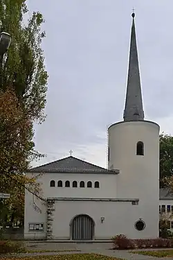In dem Bau spiegeln sich unterschiedliche Stilrichtungen wider, die bizarre Formenwelt des Expressionismus und die Schlichtheit des Neuen Bauens. Das äußere Erscheinungsbild ist das einer Burg. Der zweiflügelige Gebäudekomplex aus weiß verputzten Mauerwerksbauten besteht aus dem zweigeschossigen Pfarrhaus und der mit einem Walmdach bedeckten Saalkirche mit eingezogenem halbrunden Chor und seitlich angesetztem Rundturm, dessen Rundung im Innenraum mit einer gekrümmten Arkade als Eingang zur Kapelle mit dem Taufbecken leicht eingreift. Bekrönt wird der Glockenturm von einem stark eingezogenen schlanken Kegeldach, auf dessen Spitze eine Turmkugel sitzt. Die Holzbalkendecken des Kirchenschiffs ohne Stützen vermitteln dem Innenraum einen basilikalen Charakter, weil die mittlere in der Breite des Chores höher angeordnet ist. Über der Apsis befindet sich ein Oberlicht, das den Altarbereich indirekt belichtet. Das Kirchenschiff hat fünf Fensterachsen mit nur linksseitiger Fensterreihung. Das Portal befindet sich in einem Anbau an der Giebelseite.
