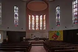 Signifikant und prägend für den Innenraum sind die Kirchenfenster des Düsseldorfer Malers Heinrich Campendonk. Die fünf durch überlebensgroße Engelsfiguren dominierten Chorfenster erfüllen die Kirche bei Sonneneinstrahlung dank der Südrichtung mit den bestimmenden Farben Gelb, Orange und Rot. Die weiteren Symbolfenster im Kirchenschiff zeigen die Motive Liebe (Herz), Hoffnung (Anker) sowie Glaube (Kreuz). Ein Duplikat eines der Kapellenfenster befindet sich im Vatikanischen Museum. Altar, Ambo, Tabernakel, Kreuz und Taufbecken wurden nach der Grundsanierung von 2007 nach einem Entwurf des Hamburger Designers Andreas Kasparek realisiert.[1]