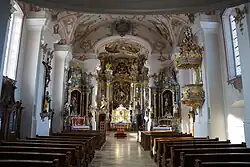 Der Innenraum des Chors ist mit einem Tonnengewölbe überspannt, der des Langhauses mit einer Flachdecke. Die Deckenmalerei, die aus Fresken besteht, wurde erst 1948 hinzugefügt. Zur Kirchenausstattung gehört ein Hochaltar, auf dessen Altarretabel zwischen Säulen ein Gnadenbild mit einer Mondsichelmadonna dargestellt ist.