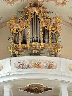 Die Orgel auf der oberen von zwei Emporen im hinteren Teil der Kirche wurde 1767 von Johann Konrad Funtsch aus Amberg gebaut, sie ist eines seiner größten Werke, insgesamt sechs davon sind noch erhalten. Das Instrument hat 16 Register auf zwei Manualen und Pedal. Alle Holzregister sind überkommen, die Metallregister bis auf Mixtur minor, Gamba und Salicional. Das Principal 8′ wurde im Ersten Weltkrieg nicht eingeschmolzen. Der Umfang der Manualwerke und des Pedals sowie die Spieltraktur sind fast unverändert erhalten. Eine grundlegende Restaurierung führte 1972 die Firma Klais Orgelbau durch. 2004 nahm Orgelbau Kuhn eine Revision vor.[1][2] Die heutige Disposition lautet:
