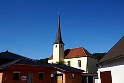 Die Saalkirche wurde 1723 unter Einbeziehung romanischer Mauerteile errichtet. Sie besteht aus einem Langhaus, einem eingezogenen, dreiseitig geschlossenen Chor im Süden und einem spätgotischen Kirchturm an der Ostwand des Langhauses. Sein oberstes Geschoss, das mit einem spitzen Helm bedeckt ist, beherbergt den Glockenstuhl. Südlich des Kirchturms schließt sich die Sakristei an.