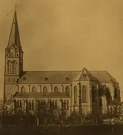 Die ursprüngliche neogotische dreischiffige Rundpfeilerbasilika mit ausladender Dreikonchenanlage, sich zum Chorraum und zum Querschiff öffnenden Nebenchören und vorangestelltem hohen Turm mit Maßwerkrose und oktogonalem Spitzhelm wurde nach der schweren Kriegszerstörung im Häuserkampf des Winters 1944/1945 als balkengedeckte Stufenhalle mit einer wuchtigen Doppelturmfassade im Stil des neoromanischen Abstraktions-Historismus wieder aufgebaut.