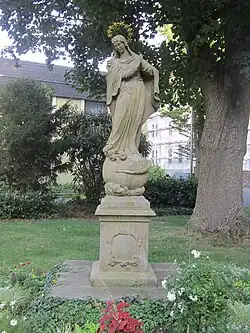 Die heute neben der Kirche befindliche Marienfigur von 1716 trägt auf dem 1 Meter hohen Sockel mit quadratischem Querschnitt die Inschrift:[2]