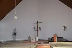 Die Fenstergestaltung wurde von Josef Baumhauer in Glasbetontechnik ausgeführt.